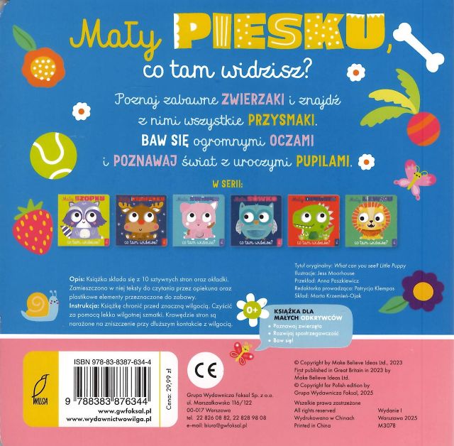 „Co tam widzisz?” to seria książeczek sensorycznych z dużymi oczami z ruchomym elementem w środku. Zabawnym ilustracjom o żywych kolorach towarzyszą dowcipne rymowanki o przeróżnych zwierzątkach. Doskonały sposób na ćwiczenie spostrzegawczości i zmysłu dotyku u małych dzieci.
